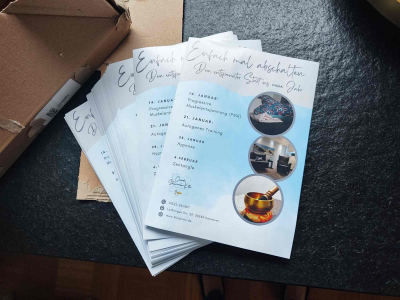 Die ganze Zeit wollte ich eine Veranstaltungsreihe zum Thema Entspannung machen, habe es aber nicht konkretisiert. Und dann ging wieder alles ganz schnell, das Konzept steht und schwupp, waren auch schon die Flyer gedruckt, 4 Abende ab Mitte Januar mit verschiedenen Ansätzen zur Entspannung, mit progressiver Muskelentspannung, autogenem Training, Hypnose und Zentangle.